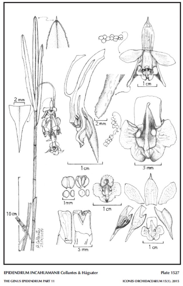 "Epidendrum incahuamanii belongs to the GROUP Coronatum SUBGROUP Aristisepalum, which has a caespitose habit, simple stems, sub-coriaceous leaves, an arching-nutant, racemose inflorescence without spathaceous bracts, a thickened disc on the 3-lobed lip, and especially the lateral sepals which are apically prominently aristate-complanate, .6 to .8" [15 to 20 mm] long. The species is recognized by the linear-lanceolate leaves 1 to 6" x .12 to .36" [2.5 to 15 x 0.3 to 0.9 cm], the lip deeply 3-lobed, lateral lobes dolabriform-subelliptic, oblique, the disc thickened into a semi-circular plate, traversed by a prominent mid-rib extending to the apex of the mid-lobe which is .1 x .24" [2.5 x 6 mm], semi-circular, apex usually retuse. Epidendrum birostratum has wider leaves, 2.6 to 5.2" x .52 to .6" [6.5 to 13 x 1.3 to 1.5 cm], the lip with dolabriform-rounded lateral lobes, mid-lobe as long as the lateral lobes, cuneate, sub-quadrate, the apex sinuous-truncate, 3-dentate; disc with the thickened plate sub-quadrate-ovate. Epidendrum aristisepalum Hágsater & Dodson from southern Ecuador has similar leaves 2.4 to 4.58" x .28 to .44" [6 to 14.5 x 0.7 to 1.1 cm], but the ecallose lip has a sub-orbicular mid-lobe with the disc thickened into 3 prominent longitudinal ribs. Epidendrum jalcaënse Chocce-Peńa, Dalström, Hágsater & J.Arnaiz has wider, shorter leaves, 1.88 to 2.64" x .4 to .6" [4.7 to 6.6 x 1.0 to 1.5 cm], bright orange flowers with a wide, 4-lobed, ecallose lip, with 5 thickened ribs on the disc." Hagsater etal 2015