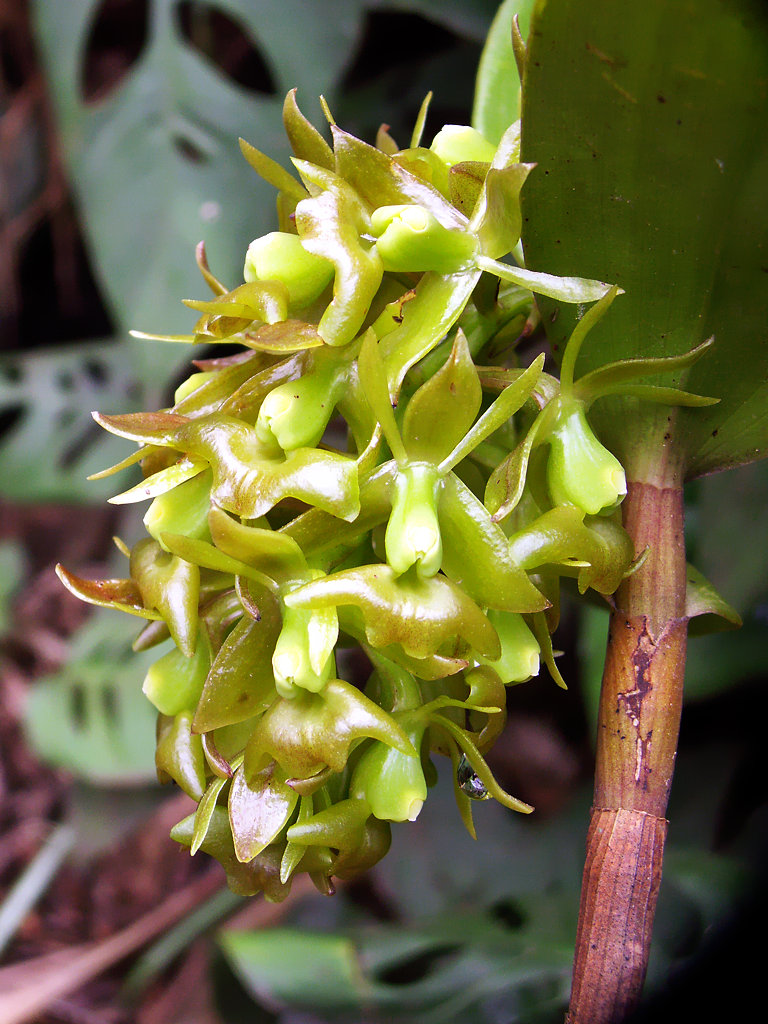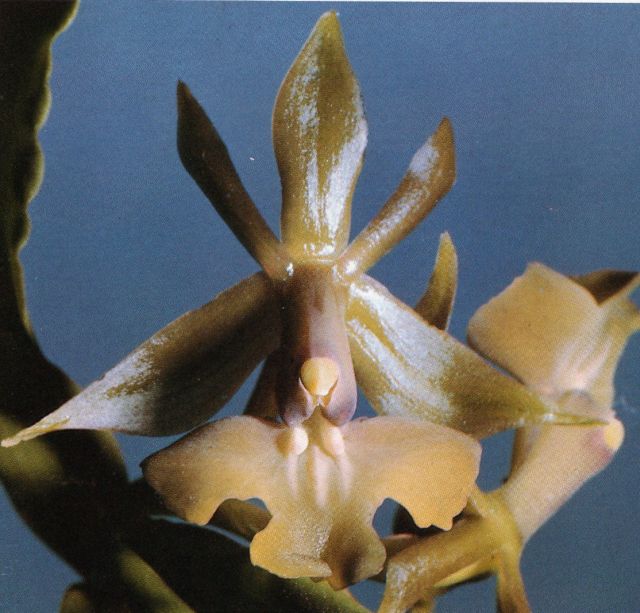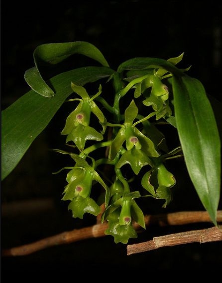 Found in Mexico, Guatemala, Costa Rica, Panama and Colombia at elevations of 900 to 1600 [2100] meters as a miniature to medium sized, warm to cool growing epiphyte with stems arising from the middle node of the previous, simple, cane-like, terete stem carrying 2 to 4, in the apical 1/3, articulate, alternate, erect-spreading, oblong-elliptic, acute, subcoriaceous leaves with an entire margin that blooms in the wild from summer through winter and in cultivation in the late winter and spring on a terminal, racemose to rarely paniculate, 1 to 1 1/2" [2.5 to 3.75 cm] long, 5 to 20 flowered inflorescence with linear-lanceolate, acuminate floral bracts that are half the length of the ovary.