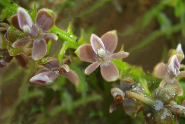 Found in Risaralda and Choco departments of Colombia on the upper Pacific slope of the Cordillera Occidental at elevations of 2150 to 2500 meters as a large sized, cold growing terrestrial with branching when mature, branches shorter, cane-like, laterally compressed, erect, straight stems carrying numerous, all along the stems, articulate, alternate, sub-coriaceous, elliptic-lanceolate, acute, margin entire leaves that blooms at most any time of the year on a terminal, without a spathe, racemose, erect, occuring only once, cylindrical, peduncle .28 [7 mm] long, subterete, thin, rachis 7.32" [19.3 cm] long, terete, straight, densely, simultaneously 50 to 60 flowered inflorescence with shorter than the ovary, triangular, shortly acuminate, embracing floral bracts and carrying non-resupinate, fleshy, dorsally green, ventrally purple flowers with a entirely purple column.