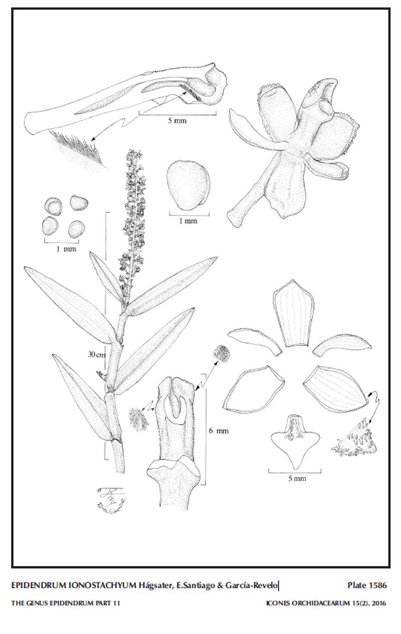 "Epidendrum ionostachyum belongs to the GROUP Macrostachyum SUBGROUP Macrostachyum, which is characterized by the monopodial plants with sub-apical branching, rugose leaf sheaths, racemose inflorescence, and fleshy flowers with a simple, conduplicate lip embracing the column, and the nectary pubescent to papillose in front of the stigmatic cavity. The species is recognized by the cylindrical, densely many-flowered inflorescence, flowers pale purple ventrally, dorsally green, sepals .24" [6 mm] long, dorsally echinate, petals falcate, apex acute, lip deltate, base truncate. Epidendrum palaciosii Hágsater & Dodson is vegetatively very similar, but the flowers are gray, sepals .32" [8 mm] long, dorsally muricate, petals oblanceolate, apex rounded, and the lip is cordiform. Epidendrum polyanthostachyum Hágsater, E.Santiago & GarcíaRevelo has cylindrical inflorescences, green flowers with turn yellow with age, sepals .4" [10 mm] long, dorsally glabrous, petals oblong-oblanceolate and the lip widely deltate, base cordate. Epidendrum borealistachyum Hágsater & E.Santiago has pyramidal inflorescence, the flowers laxly distributed along the rachis, flowers grayish lilac, lip white, sepals .32 to .36" [8 to 9 mm] long, unornamented, petals oblong with the apex rounded, not falcate." Hagsater etal 2016
