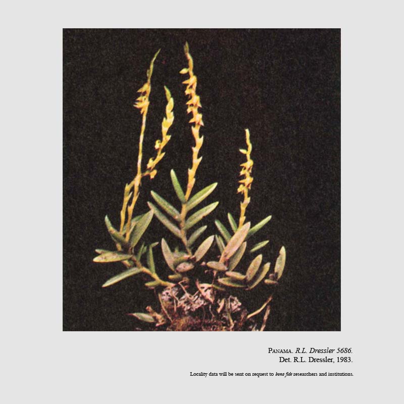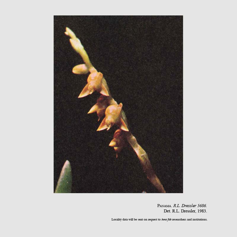 Found in Costa Rica and Panama in tree tops at elevations of 550 to 900 meters as a mini-miniature to miniature sized, warm growing epiphyte with simple, produced from the 1st or 2nd node from the base of the previous stem, cane-like, thin, very short, straight stems carrying 3 to 10, all along the stem, very fleshy, alternate, subterete, oblong-elliptic, subacute, entire margined leaves that blooms in the spring through late summer on a terminal, erect, occuring only once, racemose, laterally compressed, distichous, secund, provided with towards the middle, 1 to 2 bracts similar to the floral bracts, rachis slightly zigzag, 7 to 10 flowered inflorescence with longer than the ovary, basally amplexicaul, triangular, acute, with a high dorsal keel towards the apex floral bracts.