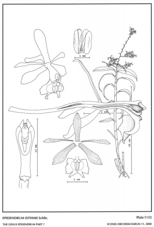 "Epidendrum isthmii belongs to the GROUP Pseudepidendrum which is characterized by caespitose plants, cane-like stems, acute to acuminate leaves, usually apical inflorescence, the filiform petals and the lip usually 3-lobed with 3 parallel fleshy keels, the apical lobe often bifurcate, the "bird-wing" type pollinia, and SUBGROUP Paniculatum which has green and white f1owers, often marked with purple on the disc of the lip and apex of the column. The species is recognized by mid to tall plants 20 to 48" [50 to 120 cm] high, with a suberect, lax-f1owered inflorescence, the greenish floral segments spreading, with the 3-lobed lip with the disc white and the margin frequently greenish. Epidendrum veroscriptum Hágsater, has somewhat taller plants to 64" [160 cm] tall with the floral segments somewhat reflexed, green, and the disc of the lip generally marked with a semicircle of purple dots. Epidendrum roseoscriptum Hágsater has shorter plants to 16" [40 cm] tall, the flowers greenish yellow with the subentire lip with a solid pink blotch on the disc." Hagsaer etal 2008