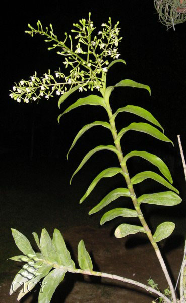 Found in Guatemala, Belize, Honduras, Costa Rica and Panama at elevations of sealevel to 1800 meters as a large sized, hot to cool growing epiphyte with a simple, cane-like, terete, very slightly thickened on the basal half, erect, straight stems carrying 9 to 15, all along the stem, articulate, alternate, subcoriaceous, lanceolate to elliptic-lanceolate, acute leaves that blooms in the late spring through winter on a terminal, occuring only once, thin, somewhat laterally compressed, straight, paniculate, suberect to slightly arching, to 9" [22.5 cm] long, laxly many [10 to 50] flowered inflorescence with the peduncle without bracts, branches with triangular, acuminate floral bracts and carrying simultaneoulsy opening flowers.