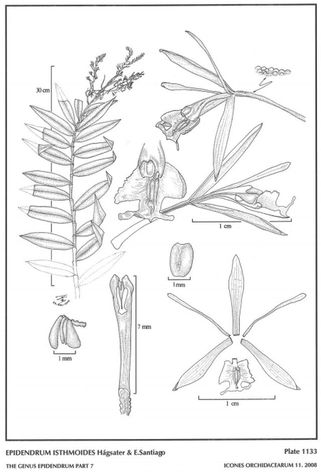 "Epidendrum isthmoides belongs to the GROUP Pseudepidendrum which is characterized by caespitose plants, cane-like stems, acute to acuminate leaves, usually apical inflorescence, the filiform petals and the lip usually 3-lobed with 3 parallel fleshy keels, the apical lobe often bifurcate, the "bird-wing" type pollinia, and Pseudepidendrum SUBGROUP Paniculatum which has green and white flowers, often marked wilh purple on the disc of the lip and apex of the column. The species is recognized by the large plants, chartaceous, elliptic leaves with the veins clearly marked, 5.2 to 9.2" x 1.2 to 2" [13 to 23 x 3 to 5 cm]; the creamy green flowers with the floral segments partly spreading, sepals .36 to .4" [9 to 10 mm] long, the lip immaculate, with a short isthmus between the lateral lobes and the midlobe. Epidendrum isthmii Schltr. has shorter, narrower, lanceolate to elliptic-Ianceolate leaves 2.2 to 5.2" x .52 to 1.36" [5.5 to 13 x 1.3 to 3.4 cm], a few-flowered inflorescence with larger flowers, sepals .52 to .62" [13 to 15.5 mm] long, the flowers greenish with the disc of the lip creamy white. Epidendrum piliferum Rchb.f. is vegetatively similar in size, but the flowers are larger, green, with the lip and apex of the column white, the disc with 5 purple lines, the reflexed sepals .5 to .68" [12.5 to 17 mm] long. Epidendrum horichii Hágsater has shorter plants, 14.8 to 30" [37 to 75 cm] tall, the elliptic to lanceolate leaves 1.4 to 6" [3.5 to 15 cm] long, the flowers green with the white lip often marked with a purple blotch." Hagsater etal 2008