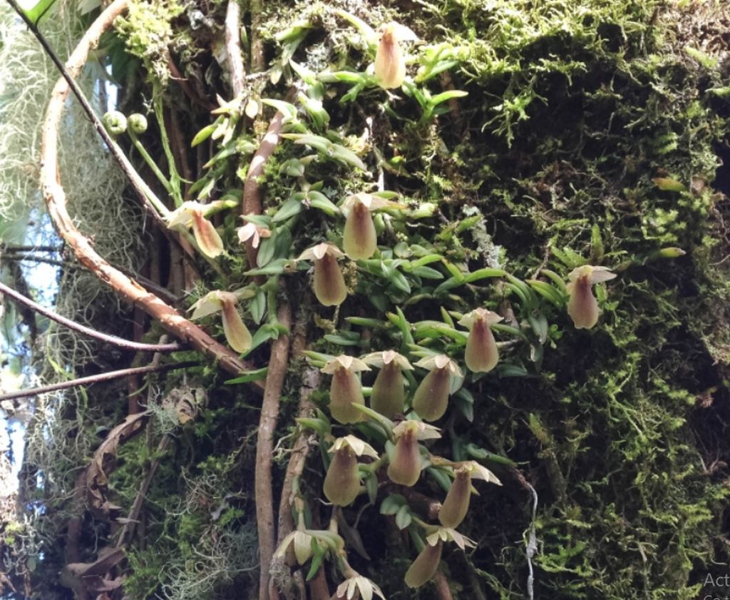 Found in Ecuador on the eastern slope of the Cordillera Oriental de los Andes above Macas, and reportedly from Peru, Dept. of Amazonas, at elevations of 800 to 1200 meters as a miniature sized, warm to cool growing epiphyte with simple, cane-like, terete, straight, sub-pendent in natural position stems carrying alternate, 4 to 5, distributed throughout the stem, basally tubular, smooth sheath; blade articulate, lanceolate, acute, succulent, smooth, green, margin entire leaves that blooms in the summer and fall on an apical, sessile, arising from a mature growth, flowering only once, through a single, ovate, conduplicate, apex obtuse spathe, single flowered inflorescence with very small, hidden by the spathe floral brqact and carrying a solitary, resupinate, fragrance none registered, tan to green flower with the lip wine-red at base, or throughout.