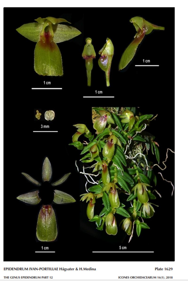 "Epidendrum ivan-portillae belongs to the GROUP Porpax, which is characterized by the small, creeping plants with succulent leaves, single flowers from a small spathe, mostly green with a usually shiny wine-red lip. The species is recognized by the oblique, arched triangular column the oblong, 1-veined petals, and the lip which is oblong-obovate, apex truncate to shallowly emarginate, corners rounded, widest near the apex, and the flowers green, with the lip only wine-red at the base or throughout. Epidendrum maxthompsonianum Hágsater & Dalström also has oblique column, the oblong, relatively wide petals, forming a cucullate hood with the dorsal sepal over the column in natural position, but the flowers are smaller, sepals .26" [6.5 cm] long, the petals wider, 3-veined, and the lip is orbicular and totally wide-red. Epidendrum gnomus Schltr. has narrowly triangular, nearly linear petals, outstretched in natural position, and the lip is ovate, somewhat cordate at the base. Epidendrum viridibrunneum Rchb.f. has linear, free petals, with the lip elliptic, the base somewhat cuneate, and elongate calli. Epidendrum mathewsii Rchb.f., which also grows in the region, has larger plants but similar sized flowers (identical to those of E. porpax Rchb.f. from Central America), with the lip reniform, convex, 3-keeled, with entire margins, and the nectary is elongate and does not form a globose vesicle on the underside of the ovary."Hagaster etal 2018