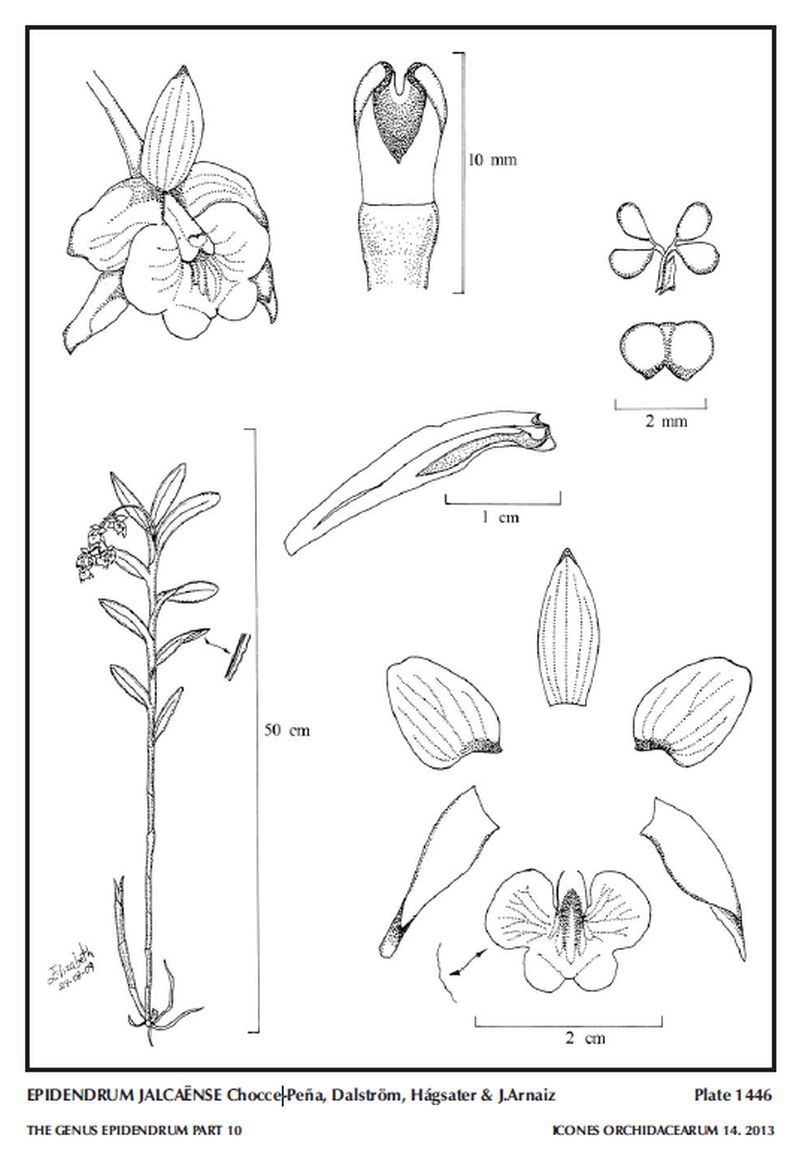 "Epidendrum jalcaënse belongs to the GROUP Coronatum SUBGROUP Aristisepalum , which has a caespitose habit, simple stems, sub-coriaceous leaves, a racemose inflorescence without spathaceous bracts, and the aristate sepals. The species is epiphytic and tall up to 22.4" [56 cm)], spreading leaves, petals 6-veined, the 3-lobed lip has 5 to 7 keels, the mid-lobe is emarginate forming a couple of semi-orbicular lobes, and the .4" [10 m] long column is stout and thick. It is similar to Epidendrum vegae Chocce-Peña & Hágsater which is a short, lithophytic herb, upright leaves, has large red to bright orange flowers with a short .3" [7.5 mm], thin column, 5-veined sepals and petals, the lip 3-lobed with 3 low parallel keels, and a very small, semi-orbicular, entire, mid-lobe. Epidendrum camilo-diazii Hágsater & Chocce-Peña has tall stems to 36" [90 cm], red to bright orange flowers, bilobed, emarginate lip with a single wide, low, fleshy keel, and straight, obovate, emarginated petals, sepals and petals 5-veined. Epidendrum chachapoyarum Chocce-Peña, Hágsater, Acuña-Tarazona & Vega-Vera is terrestrial, has short stems to 7.2" [18 cm], yellow flowers, sepals 3-veined, petals 1-veined, the sub-3-lobed lip is bicallose, the calli elongate, and a thickened rib in between, disappearing before the mid-lobe. Epidendrum aristoloides Hágsater & Dodson has pale pink flowers, the lip cream colored, prominently 4-lobed, the lobes all semi-orbicular, narrow leaves .2 to .32" [5 to 8 mm] wide, and .44 to .54" [11 to 13.5 mm] long sepals. Epidendrum birostratum C. Schweinf. has leaves up to .6" [15 mm] wide, flowers brownish-maroon, column light green, lateral lobes the lip light green, mid-lobe light maroon, 3-lobed, the mid-lobe tridentate at the apex with a prominent 2-lobed callus and one keel, and sepals .56 to .68" [14 to 17 mm] long. Epidendrum aristosepalum Hágsater & Dodson has cream-green to brownish-orange flowers, the column and disc of the lip cream 3lobed with 3 keels and the apical lobe rounded, the leaves .28 to .44" [7 to 11 mm] wide." agsater etal 2013