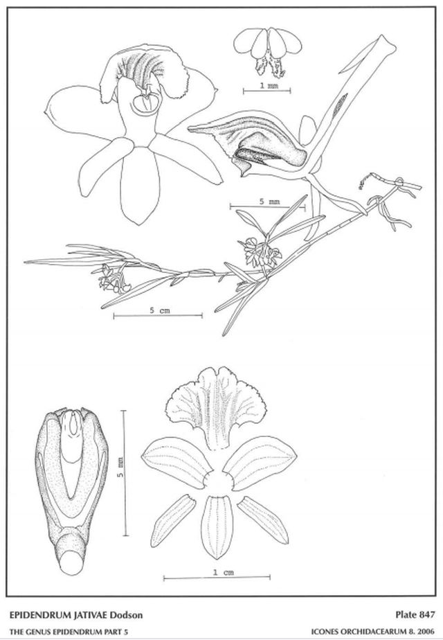 " Epidendrum jativae belongs to the GROUP Diothonea SUBGROUP Diothonea which is characterized by the branching plants, linear-lanceolate to oblong leaves, the apex bilobed, racemose, arching-nutant inflorescence, membranaceous, rarely rleshy flowers, the entire to 3-lobed, ecallose lip with the margin erose and with 1 to 10 thin keels, smooth to erose, the column completely free to obliquely united to the lip, the anther reniform. The species is recognized by the small, non-resupinate flowers, subglomerulose inflorescence, concave, subreniform lip apex 4- lobed, the external lobes shorter, oblong petals and the straight column, totality united to the lip, though this is not obvious from the small flowers. It is somewhat similar to Epidendrum microdiothoneum Hágsater & Dodson which has resupinate flowers, the ovary provided with a prominent vesicle, and a prominently arching, incurved column obliquely united to the lip which is 4-carinate and convex, somewhat longer than wide, and the lobes are all similar in area. Epidendrum cochabambanum Dodson & Vásquez also has small flowers, but the lip is cuneate, the flowers resupinate and the inflorescence has 3 to 6 flowers." Hagsater etal 2006