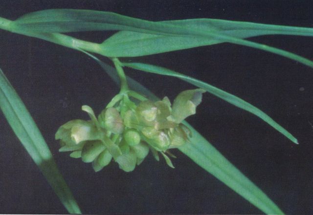 Found in Ecuador in wet, montane cloud forests at elevations around 730 to 1700 meters as a small sized, warm to cool growing epiphyte with creeping, often branching then erect, produced from the base of some upper stems, cane-like, erect, terete, thin, straight stems enveloped by tubular sheaths which are leaf bearing and carrying loosely distichous, erect to spreading, membraneous, narrowly ovate to oblong, acute leaves that blooms in the fall on a terminal, arcuate, to .4" [1 cm] long, congested, successively few, 8 to 13 flowered inflorescence with about half as long as the ovary, gradually shorter, narrowly triangular, acuminate floral bracts and carrying non-resupinate, greenish, more or less tinged with burgundy red to purplish brown flowers.