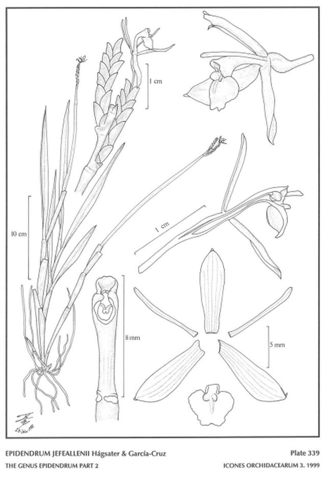 "E. jefeallenii belongs to GROUP Alberti SUBGROUP Allenii , characterized by the sympodial habit with laterally compressed to ancipitous to fusiform-thickened stems giving rise to both terminal and lateral, racemose, distichous inflorescence with more or less imbricating bracts and carrying a single successive flower. The species can be recognized by its narrower floral bracts, cordiform lip, with emarginate apex and 5-6 mm wide, sepals narrowly obovate. Epidendrum adnatum has a entire, ovate, acute lip, .12 to .16" [3 to 4 mm] wide, sepals lanceolate. Epidendrum lankesterii Ames, has wider leaves, inflorescence longer than the apical leaves, wider floral bracts, subrounded to subovate lip, slightly lobulated toward basal half, .16" [4 mm] wide, disc without keels. Epidendrum maduroi Hágsater & Carcía-Cruz, has wider leaves and floral bracts, entire, subreniform lip, disc unicarinate. Hagsater etal 1999