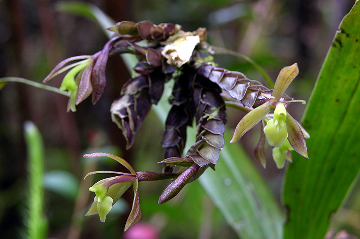 Found in Panama in cloud forests at elevations of 850 to 1000 meters as a medium sized, warm growing epiphyte with simple, cane-like, basally terete, ancipitous towards the apex stems carrying linear-lanceolate, acuminate, narrowly cuneate basally leaves that blooms at any time of the year on a terminal, pluriracemose, occuring several times, long-pedunculate, ancipitous, bi-alate, wings prominent at the base inflorescence with conduplicate, shorter than the ovary, oblong, obtuse, imbricate, completely enveloping the rachis floral bracts and carrying 5 to 10, racemose, successively single flowers.