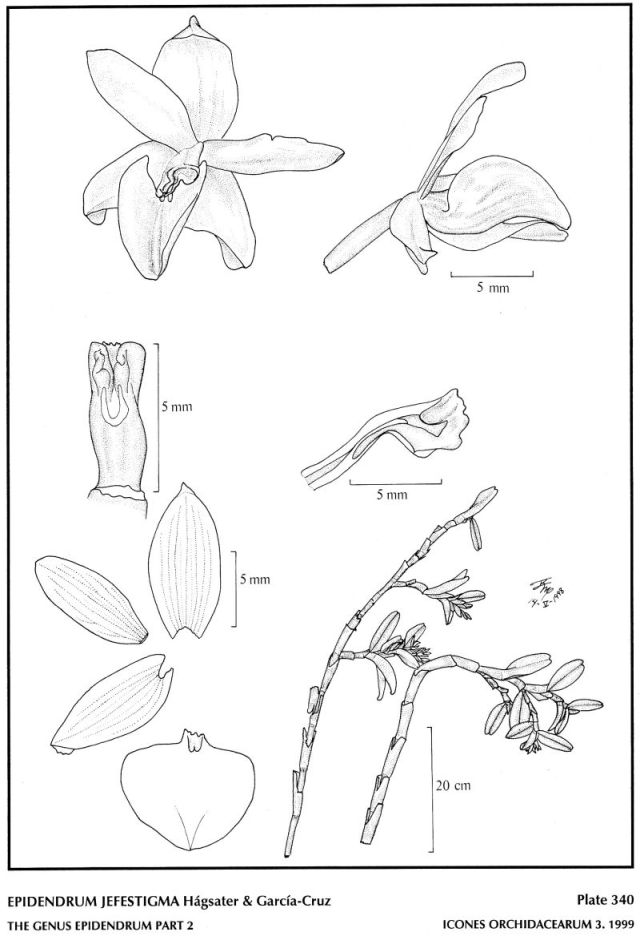 "Epidendrum jefestigma belongs to the GROUP Ramosum SUBGROUP Platystigma characterized by the monopodial, erect plants with a clear primary stem, branching occurs from the axil of the leaves, producing short, few, small leaved branches, and these produce successive, short branches from a subapical internode, thus an old plant has numerous branches, these progressively made of fewer elements, and often lacking the juvenile, long leaves, at this stage the plant attains full flowering and often dies. The species is recognized by its large plants with elliptic leaves, secondary and tertiary branches with leaves .6 to 2" x .28 to .68" [1.5 to 5 x 0.7 to 1.7 cm], the floral bracts widely ovate, .32 to .52" [0.8 to 1.3 cm] long, f1owers whitish green, the lip and column white, ovary straight, sepals elliptic, the laterals lanceolate, acute, strongly carinate, keel erose, .12 to .28" [3 to 7 mm] wide, lip subcircular, base truncate, callus bilobate, clinandrium erose. Epidendrum ramonianum has flowers white, column green, ovary arcuate, lip widely ovate, base truncate, callus tridentate. Epidendrum penneystigma Hágsater & Carcía-Cruz has secondary and tertiary branches with leaves .6 to 2" x .18 to .6" [1.5 to 5 x 0.7 to 1.5 cm], floral bracts not imbricate, flowers white, sepals elliptic lanceolate, lip semicircular-flabellate." Hagsater etal 1999