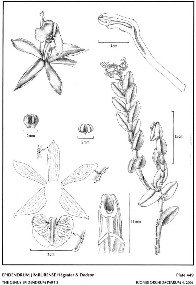 "Epidendrum jimburense belongs to the GROUP Andean SUBGROUP Orgyale characterized by the monopodial, sub-apical branching habit, erect to sub-erect inflorescences, lax, non-resupinate flowers, the lip entire. The species has a branching habit, subcoriaceous, bilobed to obtuse leaves, erect, racemose inflorescence, non-resupinate flowers with a cordate, bilobed lip; the sepals are .56 to .8" [14 to 20 mm] long and the petals and lip clearly erose-dentate, the petals 3-veined. Epidendrum orgyale Lindl. has .52" [13 mm] long sepals, petals linear-spathulate, serrulate, and lip deeply cordiform, apiculate, margins serrulate, .24 x .32" [6 x 8 mm]. Epidendrum quadrangulatum A.D. Hawkes has sepals .44 to .56" x .2" [11 to 14 x 5 mm], petals oblanceolate-cuneate, rounded, minutely denticulate, veins branching aboye, and the lip quadrate, apex broadly rounded, serrulate, undulate. Epidendrum pallatangae Schltr. has sepals .56 to .64' [14 to 16 mm], clinandrium large, erose, petals obtrullate, rounded, entire, 3-veined, and the lip cordiform with prominent keels." Hagsater etal 1999