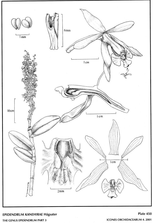 "Epidendrum kanehirae is part of GROUP Coronatum characterized by the relatively large plants with stems carrying many leaves and blooming on an apical, racemose inflorescence without spathaceous bracts and large waxy flowers with a 3 lobed lip that is basally bicallose. The species has simple canes, fleshy leaves, no spathe, an arching, paniculate inflorescence with numerous fleshy flowers, the sepals elliptic, narrowed near the base, the laterals prominently keeled dorsally, and the 3-lobed lip with dolabriform lateral lobes, a cuneate, retuse midlobe and the calli laminar, the disc with very low radiating fleshy veins. Closely related to Epidendrum betimainum Barb. Rodr. but it has shorter, wider sepals, and a single keel between the two calli." Hagsater etal 2001