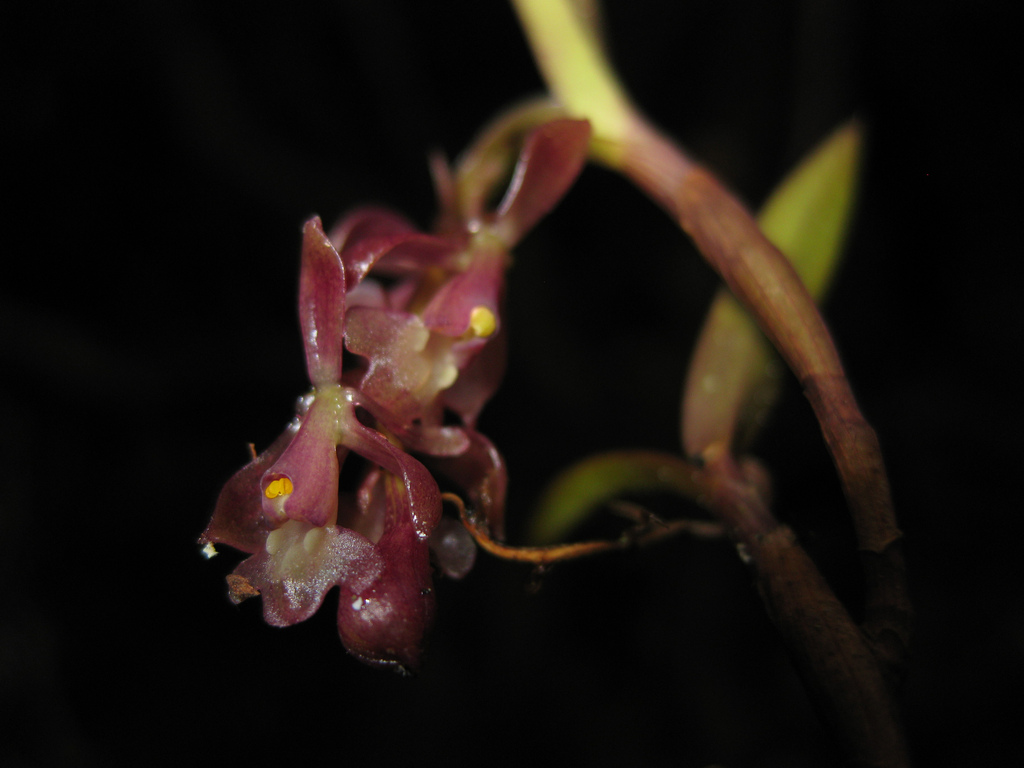 Found in Cundinamarca, Boyaca and Magdalena departments of Colombia at elevations around 2600 to 2900 meters as a small to large sized, cold growing epiphyte with many branching stems each arising from an intermediate node of the previous, simple, cane-like, terete stem enveloped by loose, tubular, striate, minutely verrucose, leafless to leaf-bearing sheaths and carrying 1 to 3, narrowly elliptic-lanceolate, acute, subcoriaceous leaves that blooms in the winter and early spring on a terminal, nodding, racemose, 8 to 10 inflorescence that is 2 winged, the wings prolonged into the triangular, acuminate floral bracts that are as long as the ovaries and carry simultaneously opening, resupinate flowers.