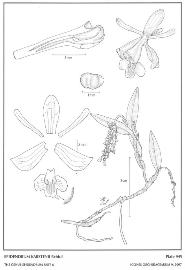 References W3 Tropicos, Kew Monocot list , IPNI ; Repert. Spec. Nov. Regni Veg. Beih. 7: 248 Schlechter 1920 as E karsteni; Icones Orchidacearum 3 Plate 375 Hagsater 1999 see recognition section; Orquideas Nativas del Tachira Cesar Fernandez 2003 photo ok; Icones Orchidacearum 7 Plate 791 Hagsater and Sanchez 2004 see recognition section; Icones Orchidacearum 9 Plate 949 Hagsater & Sanchez 2007 drawing fide; Orquideas, Tesoro de Colombia Vol 2 Ortiz & Uribe 2017 drawing fide/Photo good; Icones Orchidacearum 16[2] Plate 1671 Hagsater & Sanchez 2018 See recognition section; Icones Orchidacearum 18(2) Plate 1876 Hagsater & Jimenez 2021 LCDP Photo/photo
