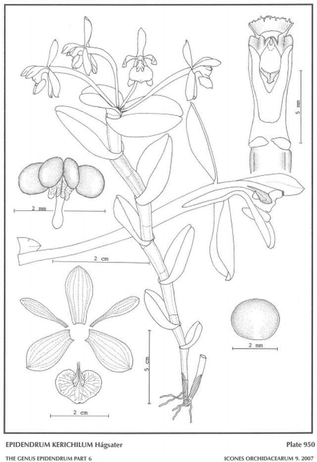 "Epidendrum kerichilum belongs to the GROUP Difforme which is characterized by the caespitose sympodial plants, fleshy, pale green to glaucous leaves, apical inflorescence, sessile, rarely with a short peduncle, single flowers to corymbose, without spathaceous bracts, fleshy green to yellowish-green, rarely white flowers. The species can be recognized by the somewhat laterally compressed stems, 3 to 4 pale green flowers, the lip entire, cordiform, of a waxy nature, ivory-colored and lustrous, the column arched in the middle prominent clinandrium-hood with the margln erose-dentate. It is similar to E. odontochilum Hágsater, which is found along the Atlantic slope of Costa Rica and Panama, and has the veins of the leaves clearly marked, a 3-lobed lip, with the margins of the lateral lobes dentate, the column with a prominent tooth on each side, and the clinandrium-hood deeply fimbriate. Epidendrum storkii Ames is common from central Costa Rica to central Panama, also has evidently marked veins of the leaves, and a 3-lobed lip with a very short midlobe recessed in between the lateral lobes, subquadrate at the base and triangular at the apex, and the clinandrium-hood deeply fimbriate." Hagsater etal 2007