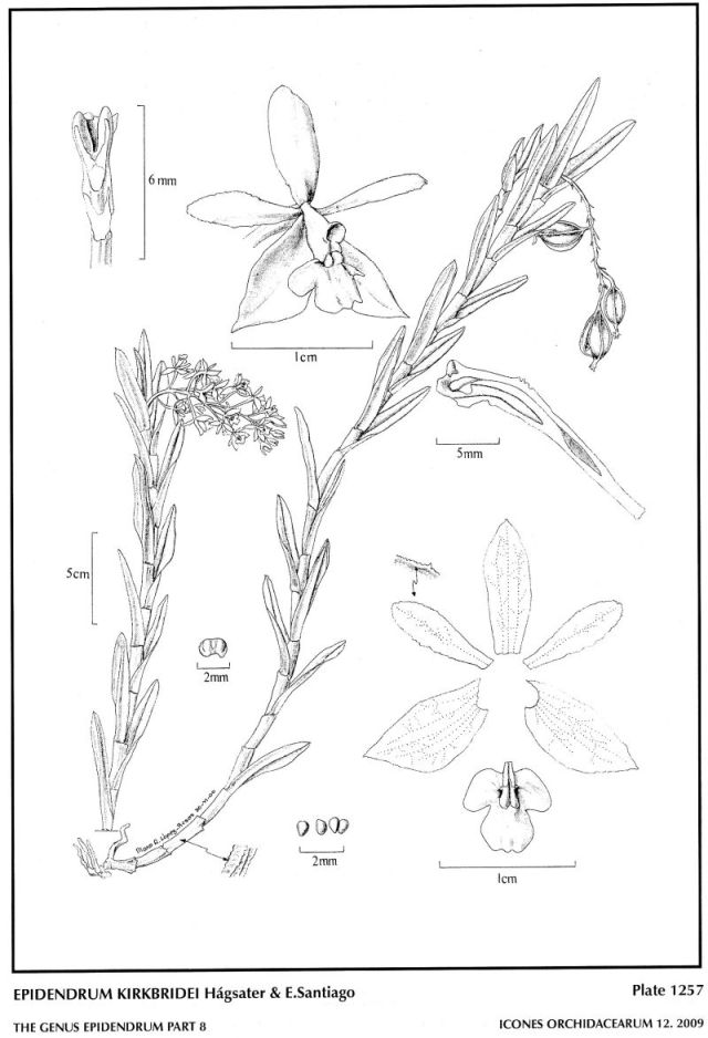 "Epidendrum kirkbridei belongs to the GROUP Andean SUBGROUP Cernuum, characterized by the monopodial habit, cane-like stems with sub-apical branching, the branches shorter than the main stem, coriaceous to sub-coriaceous leaves and fleshy flowers, the lip 3-lobed. The species is recognized by the suberect leaves, apically obtuse to rounded, pink-colored flowers with white calli, sepals .24 to .48" [6 to 12 mm] long, and very small floral bracts to .24" [6 mm] long. Epidendrum zipaquiranum has acute leaves, green to yellow, fragrant flowers, very prominent floral bracts to .56" [14 mm] long, and the apex of the sepals obtuse with a dorsal keel. Epidendrum chioneum Lindl. has snow-white flowers, sepals .24 to .36" [6 to 9 mm] long, and prominent, .64" [16 mm] long floral bracts." Hagsater etal 2009