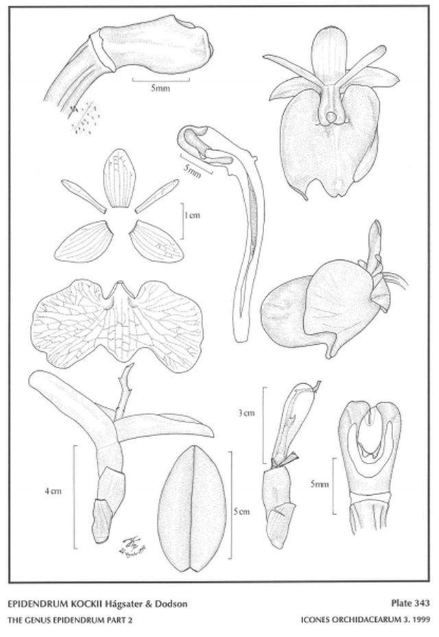 "Epidendrum kockii is the type for the GROUP Kockii characterized by the caespitose habit, with 1 to 2, fleshy succulent leaves, an inflorescence subtended by 1 to 2 spathaceous bracts and 1 to 3 resupinate or not flowers with a prominent , fleshy, vernicose 3 lobed lip. The species is recognized by its short, fleshy stems and leaves, two spathes at the base of the 3-flowered inflorescence, and the very large flowers with the obreniform lip twice as wide as long, 1.6" [4 cm] across. It is closely related to E. cupreum Lehm. & Kraenzl., which has an entire, suborbicular lip. Epidenrum sophronitis Rchb. f. has one-leaved pseudobulbs and a long, acuminate, cordiform lip The lip, with a small, triangular apical lobe sets it close to E. numbalense Hágsater & Dodson [Still not officially described but soon coming] pers comm Hagsater 5/20] which has 2 to 3 leaves per stem, and the very similar but much smaller flowers, and the petals proportionately much wider. The outline of the lip is also very similar to E. nigricans, but this species has much smaller flowers and an elongate inflorescence." Hagsater etal 1999