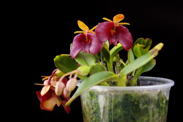 Found in southern Ecuador and Peru? without elevational data as a mini-miniature sized, cool growing epiphyte with fleshy, laterally compressed, short stems completely enveloped by 2 imbricating sheaths and carrying 2, fleshy-succulent, elliptic, green, margins and undersides tinged with purple leaves that blooms in the spring on an erect, terminal, on a mature stem, occuring only once, peduncle erect, laterally compressed, 1.4" [3.5 cm] long, simultaneously 1 to 3 flowered inflorescence with much shorter than the ovary floral bracts.