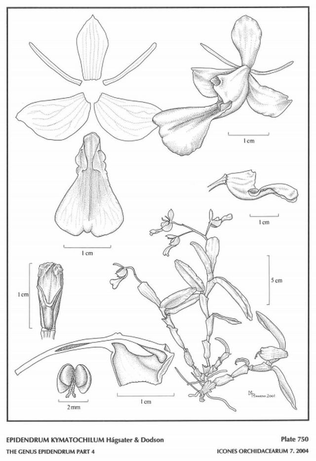 "Epidendrum kymatochilum is part of GROUP Megalospathum SUBGROUP Cupreum recognized by the single, wide, semi-ovate spathe and the erect stems with 3 to 5 coriaceous leaves and a few resupinate flowers, the ventral surface of the column with a cavity accessed through a long narrow slit. The species is recognized by the large flowers, sepals .56 to .76" [14 to 19 mm] long, the cuneate, flabellate, lip with a pair of incipient, basal hemicircular lobes, their margin undulate and the pair of laminar calli. It resembles Epidendrum orbiculatum closely, but this species has a suborbicular lip, somewhat wider than long, the margin entire, and is found in southern Peru, near Cuzco. Epidendrum cupreum F. Lehm. & Kraenzl. has smaller flowers, the sepals .4" [10 mm] long, and the lip ecallose; this species is distributed along the eastern slope of the Andes from southern Colombia to southern Ecuador." Hagsater etal 2004