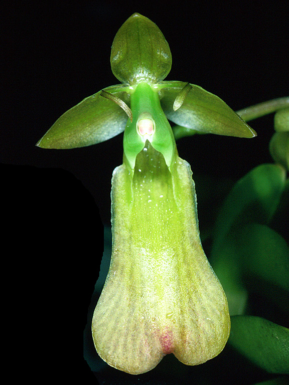 Found in Ecuador and Peru between the adjacent province of Loja and department of Ayabaca in cloud forests at elevations between 2800 to 3500 meters as a small sized, cold growing epiphyte with a simple, cane-like, arising from near the base of the previous, progressively laterally compressed above, somewhat flexuous stem almost completely enveloped by inflated, well spaced, leafless below and leafy above sheaths and carrying 3 to 4, distributed throughout the stem, laterally compressed, somewhat infundibuliform when dry, lanceolate to oblong-ellipitc, unequally bilobed apically, coriaceous leaves that blooms in the fall through spring on a terminal, arising through a compressed, obovate, rounded apically, conduplicate spathe, somewhat arcuate, thin, laterally compressed, 4.2 to 6" [10.5 to 15 cm] long, few flowered inflorescence with very small, triangular, acute, clasping floral bracts and carrying 3 to 5, simultaneously opening flowers.