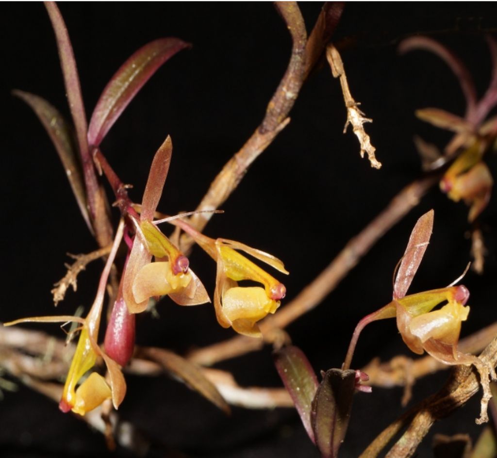 Found in San Martin Department of northern Peru, east of the Andes in wet montane forest with abundant moss and lichens at elevations of 1565 to 1765 meters as a large sized, cool growing epiphyte .with the primary stem 24" x .16 to .2" [60 x 0.4-0.5 cm] long, secondary branches .6 to 1.8 x .08 to .12" [1.5 to 4.5 x 0.2 to 0.3 cm], cane-like, terete, thin, the branches produced throughout the length of the primary stem, secondary branches themselves branched, produced from apical internodes of the previous segment or branch and carrying numerous and distributed throughout young primary stem, deciduous when stem mature (i.e. branched), 2 to 3 on the secondary branches; alternate, articulate, erect-spreading, slightly arched, sub-coriaceous; sheathes tubular, striated, rugose, red-brown; blade on primary stem larger, on branches much shorter, linear-lanceolate, apex rounded, margin entire, spreading, dark green to wine-red-brown leaves that blooms in the mid summer on a terminal, without a spathe lacking, peduncle .28 to .4" [0.7-1.0 cm] long, terete, thin at base, gradually thickened towards the apex, straight; rachis .24 to .32" [0.6 to 0.8 cm] long, terete, thin, straight, .56 to .78" [1.4 to 1.7 cm] long, produced from the apex of the secondary branches, racemose, flowering only once, laxly successively, few 6 to 8 flowered inflorescence with much shorter than the ovary, narrowly triangular, acuminate, embracing floral bracts and carrying resupinate, ochre-red flowers with the lip ochre-yellow, column wine-red at the apex, the floral buds wine-red; fragrance of citrus, weak, in afternoon.