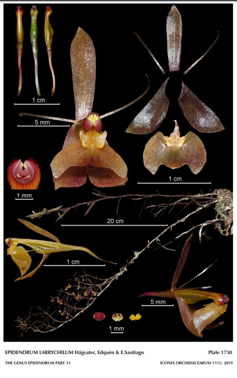 "Epidendrum labrychilum belongs to the GROUP Andean SUBGROUP Soratae which is characterized by the branching habit starting on a monopodial, primary stem, infundibuliform, rugose leaf-sheaths, lanceolate, aristate, acute leaves, racemose subcapitate inflorescence on a short, thin peduncle, and the bicallose lip. The species is recognized by the tall primary stem with numerous short branches, dark green to wine-red-brown, linear-lanceolate leaves, successive ochre flowers tinged wine-red, the lip ochre-yellow, and the apex of the column red, sepals 9 mm long, the lip forming a double-bladed axe when spread, strongly reflexed and the posterior side of the lateral lobes revolute in natural position, the calli prominent, convergent. It is similar to Epidendrum obliquum, which has concolor, yellow flowers, the apex of the column purple, sepals .24" [6 mm] long, and the lip transversely elliptic with small, globose calli. Epidendrum constricolumna Hágsater Chocce & E. Santiago produces branches towards the apex of the primary stem, has ovate-lanceolate leaves flowers of similar color and size, but the lip is orbicular, and column abruptly constricted at the base. Epidendrum monteagudoi Hágsater & E.Santiago, has shorter plants, 6.4" [16 cm] tall, which branch near the apex of the primary stem, linear-lanceolate leaves .52" [1.3 cm] long, sepals .32" [8 mm] long, and the lip with globose calli with the mid-lobe widely triangular and obtuse." Hagsater etal 2019