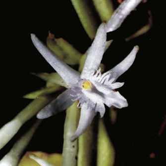 Found in Ecuador and Peru in wet montane to cloud forests at elevations around 750 to 1800 [2800] meters as a mini-miniature sized, warm to cool growing epiphyte with cane-like, erect, terete, somewhat flexuous, thin stems producing new stems from the base to the middle to the upper internodes of the previous stem carrying 2 to 5, all along the stem, equi-distant, linear-lanceolate, acute, unequal, articulate below into the base leaves that blooms in the summer through mid fall on a terminal, racemose, short, umbelliform, few flowered inflorescence with lanceolate to triangular, acuminate, dorsally carinate, progressively smaller, the basal ones longer than the ovary floral bracts and carrying 3 to 7, successive, resupinate, sweet scented flowers.