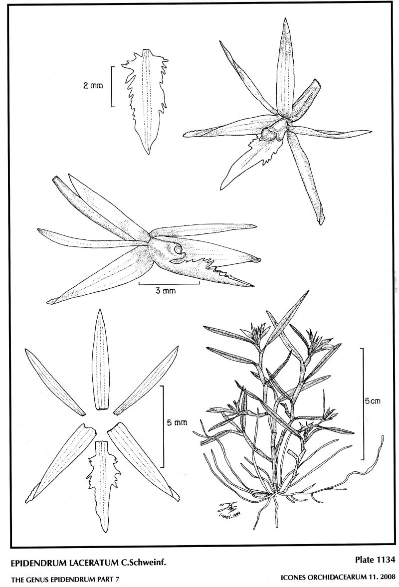 "Epidendrum laceratum belongs to the GROUP Batesii, which is characterized by the main stem with a subapical branching habit, acute leaves, successive flowers, opening one at a time, deep nectary, entire to 3-lobed lip with the lateral lobes more or less fimbriate to erose. The species is distinguished by the short stems, long and narrowly lanceolate leaves and successive, small, flowers, sepals are .22 to .24" [5.5 to 6 mm] long, the deeply lacerate-dentate lip. It is similar to Epidendrum farallonense Hágsater which has lanceolate-elliptic leaves, narrowly lanceolate, rounded, 3-veined petals and a large, rectangular, truncate midlobe of the 3-lobed lip. Epidendrum oxybatesii Hágsater & Dodson has narrowly elliptic leaves, .6 to .64" [15 to 16 mm] long sepals, 3-veined petals, deeply 3-lobed lip with the semiovate lateral lobes crenate to laciniate, the acicular midlobe and the nectary penetrating 3/4 of the ovary. Epidendrum batesii Dodson has narrowly lanceolate leaves, less deeply 3-lobed lip with the midlobe short and truncate and the nectary penetrating nearly all the ovary. Epidendrum acrobatesii Hágsater & Dodson has sepals .44 to .48" [11 to 12 mm] long, narrow, linear-oblanceolate, single veined petals and a truncate, obcuneate midlobe. Epidendrum silverstonei Hágsater has oblanceolate, rounded, 3-veined petals and an entire, suborbicular, deeply cordate lip." Hagsater etal 2008