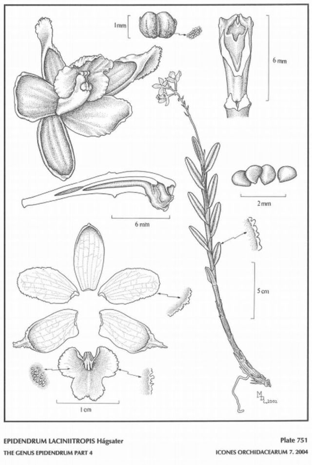 "Epidendrum laciniitropis is closely related to Epidendrum crassum both of which have a sympodial habit, simple stems, the inflorescence longer than the leaves, erect and without a spathe. The new species has red flowers, prominently keeled lateral sepals, with the keel extendlng beyond the apex of the blade and the margin laciniate; the petals are about as wide as the sepals, elliptic, with the apex rounded to obtuse, and they appear 7-veined, due to the much branched lateral veins. In Epidendrum crassum the sepals, have smaller keels and the margin entire; the petals are narrower than the sepals, oblanceolate, very narrow towards the base; that species is found in southern Peru, east of Cuzco." Hagsater etal 2004