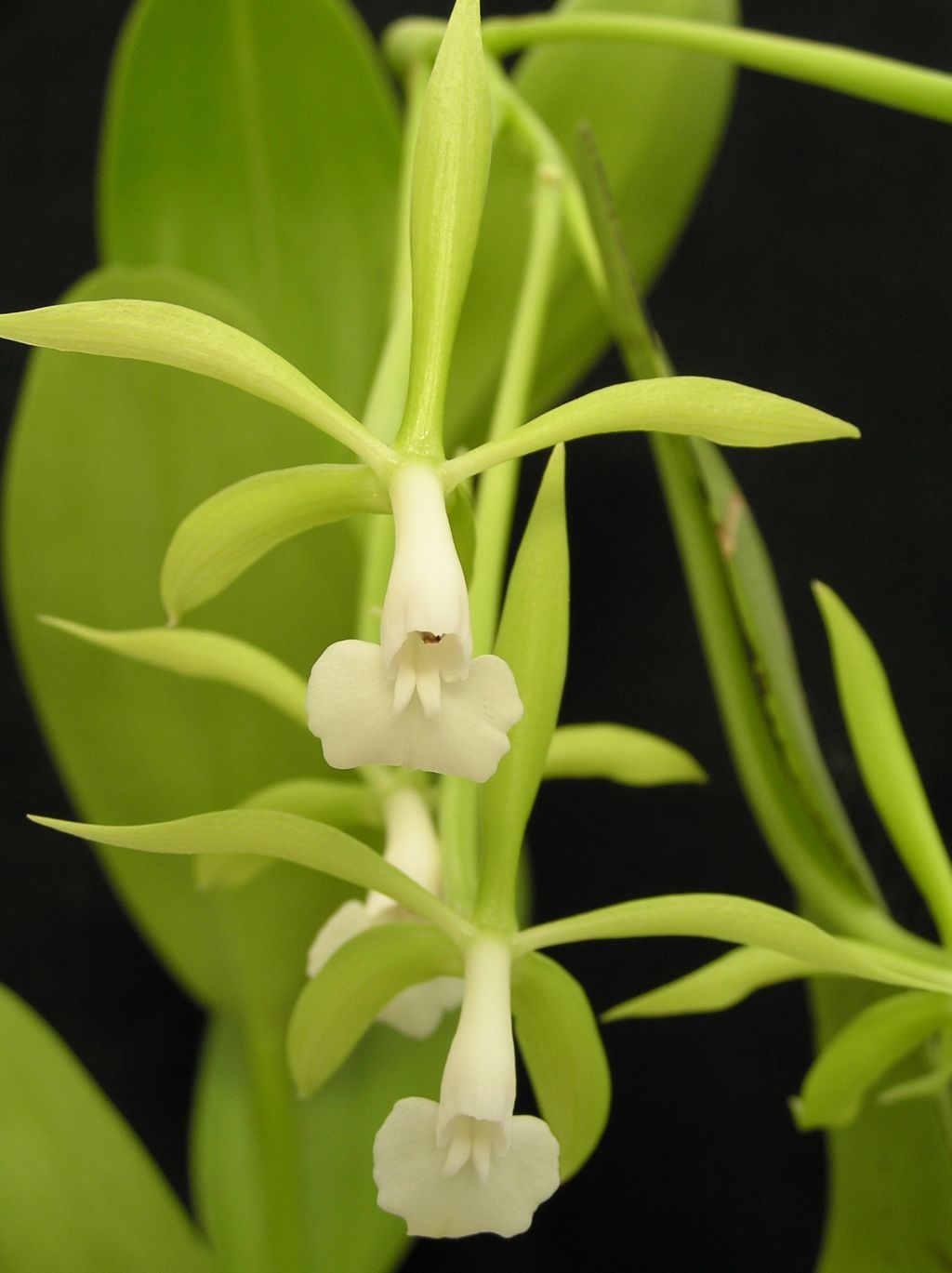 Plant photoed in Nicaragua, on Volcan Mombacho, but also found in Costa Rica, Panama, Colombia, Ecuador, Peru and Venezuela in montane rain forest or cloud forest at elevations of 700 to 2700 meters as a small to large sized, warm to cold growing epiphyte or terrestrial with a compressed, elongate stem completely enveloped by basally clasping, alternate, leaf bearing sheaths carrying, elliptical leaves that blooms in the spring on a terminal, erect, 4" [10 cm] long, several [5 to 15] flowered, racemose inflorescence arising from a green spathe with the night scented flowers held in an apical cluster.