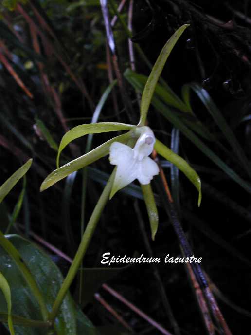 "Epidendrum lacustre belongs to the GROUP Excisum SUBGROUP Leucochilum , characterized by the caespitose plants with cane-like, erect stems, fleshy leaves, the base of the inflorescence with 1 to 2, spathe-like bracts, star-shaped flowers with narrow sepals and pctals, and a prominent, acuminate, lip. The species is recognized by the laterally compressed to ancipitose stems, generally wide, occasionally imbricating leaves, to .28" [7 cm] wide, racemose, 5 to 15-flowered inflorescence, sepals and petals green, light green to yellowish green, lip, calli and column white, the midlobe rarely green, the lip obscurely to clearly 3-lobed, without deep sini separating the midlobe from the lateral lobes, disc of the lip with a central keel running down to the midlobe. Epidendrum leucochilum Link, Klotzsch & Otto, ranges in the Andes of Venezuela to southern Ecuador on the western Andes, has terete to somewhat compressed, but not ancipitose stems, coriaceous leaves, and the 3-lobed lip is divided by deep sini, the lateral lobes transversely ovoid, and the midlobe ligulate, acute. Epidendrum lehmannii Rchb.f. similar to the latter species, ranges on the eastern Andes of Ecuador and Peru, has few, very wide leaves and smaller flowers. The star-shaped flowers are reminiscent of Epidendrum nocturnum Jacq. which lacks spathaceous bracts, and produces several, distichous, apical inflorescences which develop one flower at a time over several years." Hagsater etal 2008