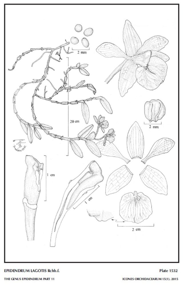 "Epidendrum lagotis belongs to GROUP Megalospathum SUBGROUP Vesicicaule characterized by the caespitose but branching habit, many-leaved stem, fleshy, oblique leaves, a short, few flowered, raceme subtended by large semi-ovate spathe, resupinate flowers, the column more or less united to the lip. The species is recognized by the straggling stems with infundibuliform leaf-sheaths, short leaves .8 to 2.4" [2 to 6 cm] long, blade ovate-elliptic the apex sub-obtuse, spatulate petals, and disc of the lip with a pair of small, sub-spherical, somewhat complanate calli. Epidendrum scutella Lindl. has tubular leaf sheaths, ovate-lanceolate, acute leaves 1.88 to 4.8" [4.7 to 12 cm] long, flowers fleshy, generally 5 per inflorescence, the lip apically subobtuse, disc with a pair of low calli with the apex bi- or tri-dentate, and petals ovate-lanceolate.Epidendrum rhomboscutellum Hágsater & E. Santiago has thin stems, narrowly lanceolate, acuminate leaves .8 to 2.4" [2 to 6 cm] long, a 2 flowered inflorescence, the flowers greenish yellow with the apex of the petals reddish brown, the lip is obovate-rhombic with the base cuneate, and the apex acute; disc with a pair of globose calli. Epidendrum rhodochilum (Schltr.) Hágsater & Dodson has pendent plants, green flowers with a red lip, smaller flowers sepals .68" [17 mm] lon), lip is obovate, obtuse, with the margin denticulate and the lip is free from the column. Epidendrum megalospathum Rchb.f. has an oblong-ovate lip with the apical margin denticulate, the elongate rachis has 6, laxly distributed flowers, and the lip is partly free from the column." Hagsater etal 2015