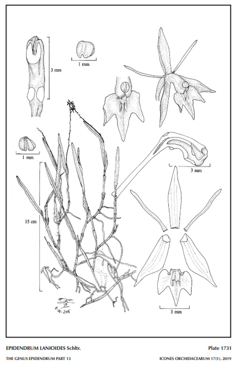 "Epidendrum lanioides belongs to the GROUP Lanium, characterized by the caespitose habit, fusiform pseudobulbs to slightly fusiform, with 1 to 6 leaves along the upper half of the stem, paniculate inflorescence, rarely racemose, with a usually tomentose peduncle, lax, erect to arched; bicallose to ecallose, simple or trilobate lip. The species has plants 2.8 to 7.6" [7 to 19 cm] tall, with fusiform pseudobulbs, bifoliate, leaves oblong-ligulate, obtuse, a short inflorescence about the length of the leaves, racemose, sepals spreading, lanceolate, petals spreading, acute, margin entire, glabrous, a 3-lobed lip, lateral lobes transversely ovate, acute, a triangular-lanceolate mid-lobe, with 3 thin parallel ribs, the mid-rib elongate. Epidendrum ciliipetalum (Garay) Hágsater & E.Santiago has simple, cane-like stems, narrowly oblong-ovate leaves, sub-acute, paniculate inflorescence, sepals reflexed, aristate, narrowly ovate to narrowly elliptic, petals reflexed, short acuminate, margin densely ciliate each cilium septate, generally branching, 3-lobed lip, lateral lobes ovate, redounded, with a prominent clinandrium-hood." Hagsater etal 2019