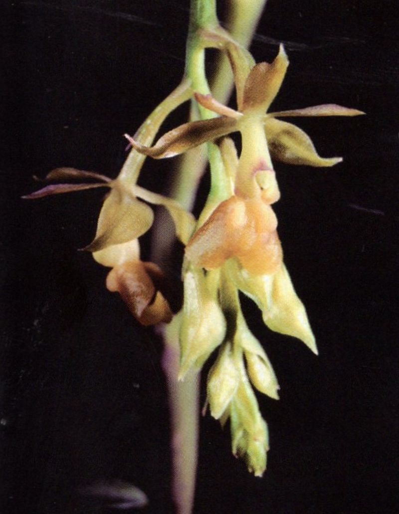 Found in Cochabamba department of Bolivia on mossy limbs in wet montane forests at elevations of 2450 to 2850 meters as a miniature to small sized, cold growing epiphyte with terete, arising from near the apex of the previous stem carrying distichous, green, carinate apically leaves that blooms in the spring and early summer on a terminal, racemose, pendulous, rachis flattened, many flowered inflorescence carrying green flowers with a maroon to dark maroon tint.