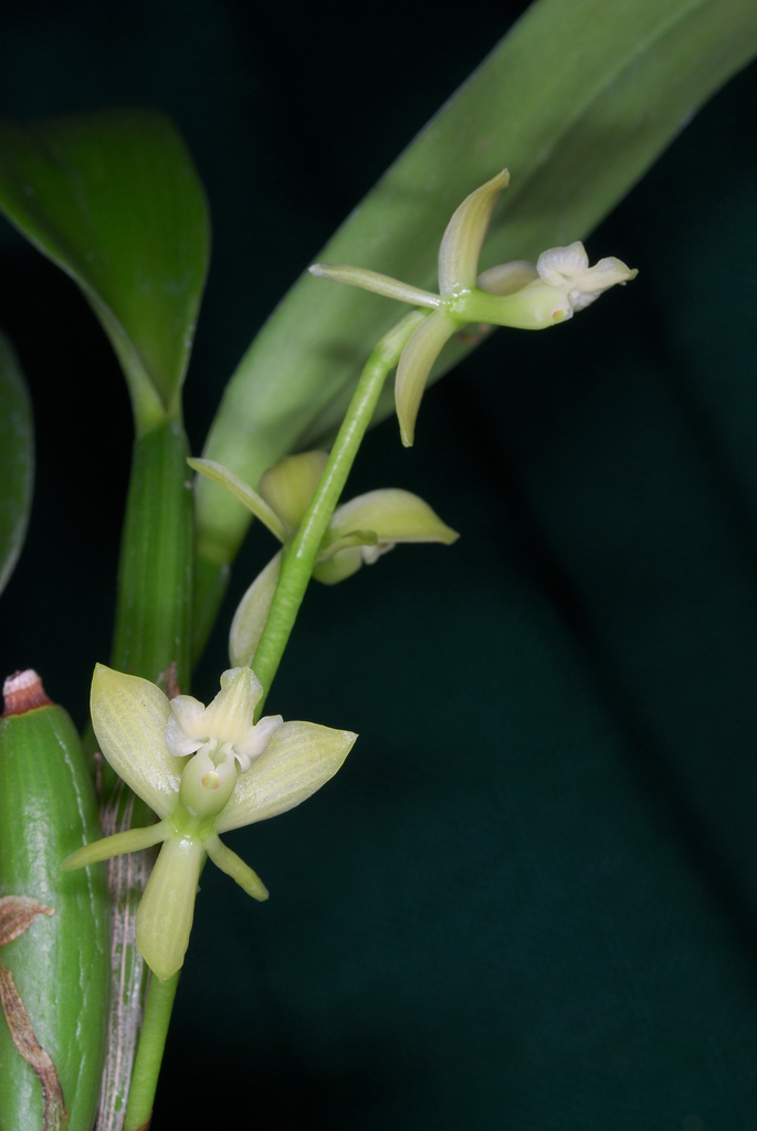 Known by its stems that form fusiform pseudobulbs, the single apical leaf, the lateral inflorescence arising from the base of the stem, that is shorter than the leaf, carrying 5 to 10, green flowers with the sepals .4 to .48" [1 to 1.2 cm] long, and a trilobed lip with long calli.