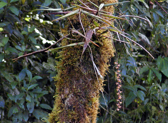 Found in in Guatemala, Nicaragua, Costa Rica, Panama and Colombia in cloud forests at elevations of 800 to 2100 meters a small sized, warm to cool growing, reedstem epiphyte with slender, erect stems enveloped by scarious, acuminate sheaths and carrying narrowly linear-lanceolate, spreading, coriaceous, basally clasping, acute leaves that blooms mostly in the summer on a terminal, arcuate to pendulous, simple, 1 1/2' [45 cm] long, few to many [to 100] flowered inflorescence with successively opening, non-fragrant flowers.