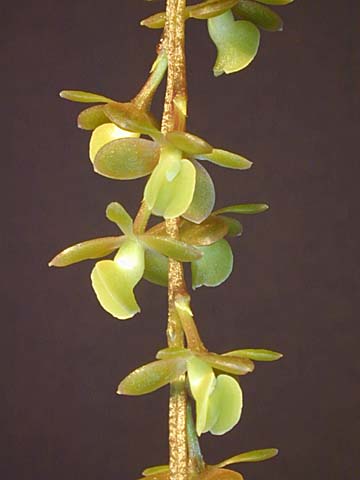 Distinguished by presenting one, very long, arching-pendent, rat-tailed inflorescence with coffee colored flowers and a yellow to purple colored lip.