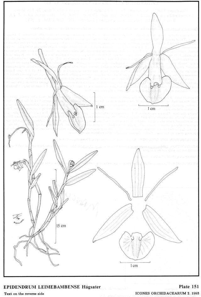 "Epidendrum leimebambense is also similar to E. buchtienii Schltr., but differs in the scandent habit and the cordiform lip with entire margins." Hagsater etal 1993