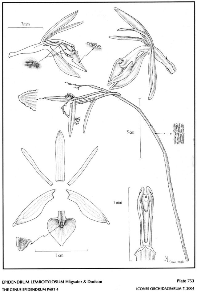 "Epidendrum lembotylosum belongs to the GROUP Elleanthoides SUBGROUP Rhombochilum , which is characterized by the thin, branching habit, narrow, short, subcoriaceous leaves with a crenulate margin and unequally bilobed apex, racemose, subdistichous, short inflorescence, with successive flowers, the entire lip embracing the column. The species is recognized by the relatively large, successive, reddish brown-violet flowers, the cordiform lip which is somewnat concave but does not embrace the column, and the oblong, concave, pubescent callus, flowering in April. The Peruvian Epidendrum caveroi from Condorcanqui, across the Nangaritza-Zamora River is florally quite similar, but the leaves are elliptic, acute and short, about as wide as long, the flowers slightly larger, the sepals being .48 to .52" [12 to 13 mm] long, and the lateral sepals somewhat joined to the ventral surface of the column; it flowers in August. Epidendrum spasmosum Hágsater & Dodson has non-resupinate flowers, white with the apices of the sepals pink to the whole flower greenish purple, the flowers are tightly cramped, with the lip embracing the column to leave only a round aperture through which the column may be reached for pollination, with subquadrate, erose lateral lobes of the lip and a small triangular apical lobe; the petals are linear to linear-oblanceolate, with the upper margin sinuous. Epidendrum golondrinense Hágsater & Dodson has a similar habit, but somewhat different, more, up to 13, smaller flowers with sepals .152" [3.8 mm] long, the lip 3-lobed, with the lateral lobes smaller than the midlobe. Epidendrum rhombochilum L. O. Williams is recognized by the triangular lip, two, lentil-shaped pollinia slit longitudinally down one slde and a lanceolate dorsal sepal." Hagsater etal 2004