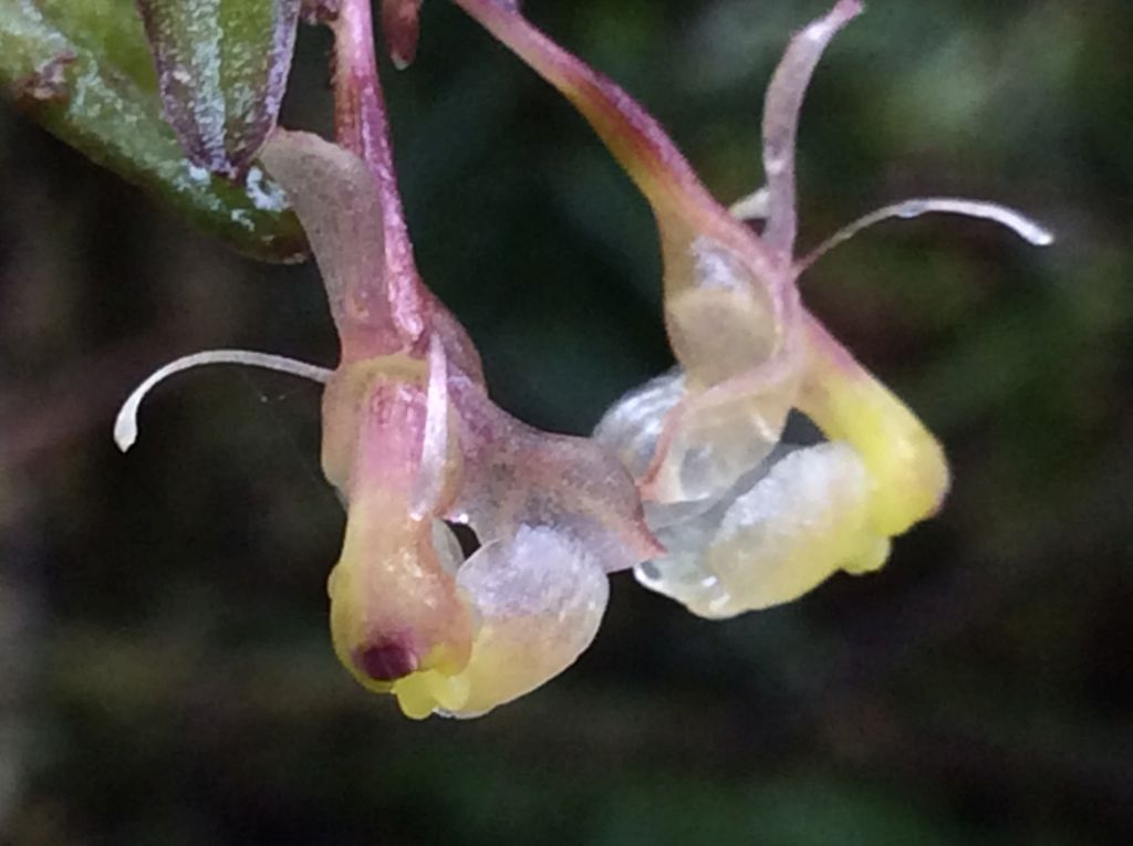 Found in Colombia and Peru in cloud forests at elevations of 2000 to 2900 meters as a small sized, cold growing epiphyte with reclining to erect, branching, canelike, reddish, basally terete, slightly laterally compressed towards the apex, very thin stems carrying 6 on the main stem, 4 to 6 on the branches, all along the stems, alternate, articulate, subcoriaceous, linear-lanceolate, obtuse, minutely apiculate, margin entire leaves that blooms in the late fall and spring on a terminal, racemose, short, 2 flowered inflorescence with shorter than the ovary, triangular, acuminate, amplexicaul floral bracts.