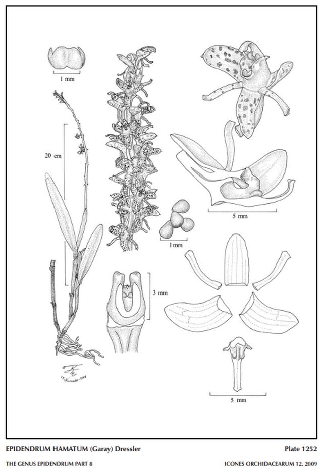 the apex. It has been confused with the rare Epidendrum hamatum (Garay) Dressler which is vegetatively very similar but the flowers are white slightly