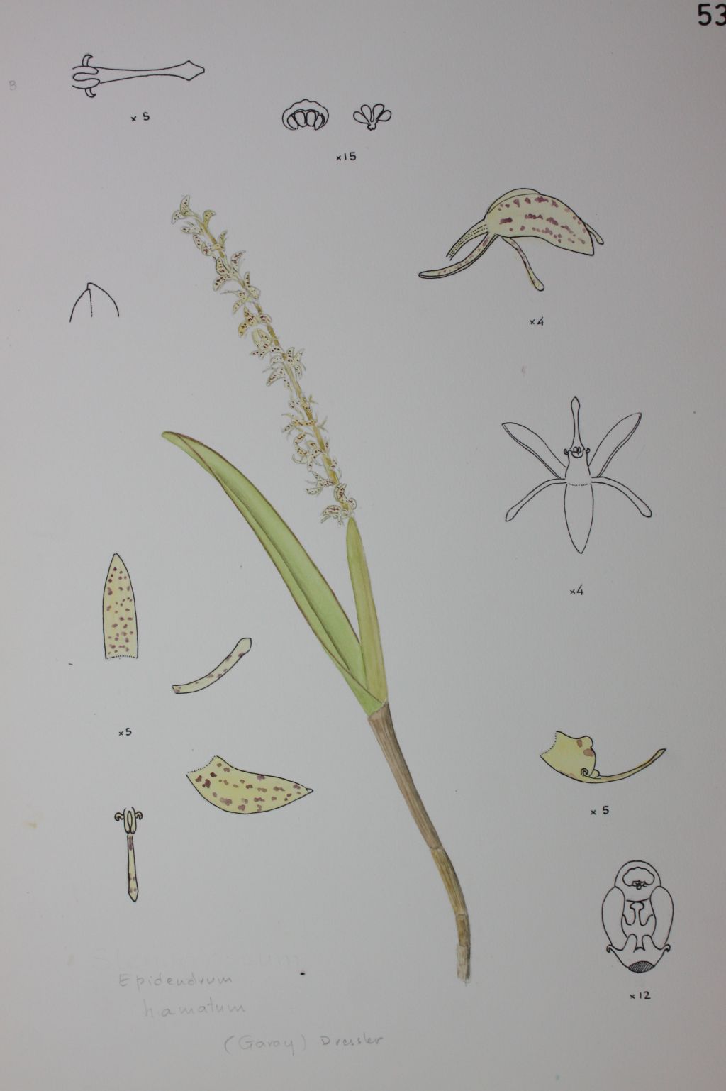 Icones Orchidacearum 18(2) Plate 1878 Hagsater & Jimenez 2021 Photos by © The Orquideologia Website Drawing by © Jimenez, Hágsater & E.Santiago and The AMO Herbario Website Original Drawing by © Padre Pedro Ortiz Conserved at the Herbario de la Universidad Javeriana, Bogota Colombia Common Name The Leopard Spotted Hooked Epidendrum [refers to the spotted flower and the lateral lobes of the lip]