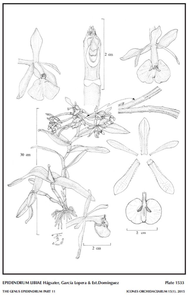 " Epidendrum libiae belongs to the GROUP Difforme which is characterized by the caespitose, sympodial plants, fleshy light green to glaucous leaves, apical inflorescence without any spathe, sessile, rarely with a short peduncle, one-flowered to corymbose, fleshy, and flowers green to yellowish-green, rarely white. The species is recognized by the laterally compressed stems, 9 to 10 simultaneous flowers, long ovary .244 to .26" [61 to 65 mm] long, scarcely ornamented with small irregular trichomes, sub-orbicular-reniform lip, with the sides obliquely revolute in natural position, with 3 thickened ribs in the middle, and additional somewhat thickened, low, radiating veins, clinandrium-hood 3-lobed, deeply fimbriate, the lateral lobes longer and narrower than the mid-lobe. It is reminiscent of Epidendrum pachyceras from Costa Rica and Panama, but that species has 1 to 3 flowers, elliptic sepals, linear-elliptic, single veined petals, a shorter ovary 1.12 to 2" [28 to 50 mm] long, and the lip does not show any evidently thickened veins, column .48 to .56" [12 to 14 mm] long, with obtuse petaloid wings, and the clinandrium dentate-fimbriate. Epidendrum pseudokillipii Hágsater & L. Sánchez, sympatric with this species has plants up to 15.2" [38 cm] tall, 2 to 3 flowers, sepals .68 to .72" [17 to 18 mm] long, a shorter ovary, 1 to 1.6" [25 to 40 mm] long, .26" [6.5 mm] wide petals with a somewhat irregular margin, the lip widely cordiform-reniform, the disc without ribs nor thickened veins, and a shorter, fimbriate clinandrium-hood. Epidendrum romero-castannedae Hágsater & L.Sánchez, found in the hills around the Gulf of Darién in eastern Panama and northern Colombia, including the Chocó, has shorter plants, 1 to 5 flowers, narrowly elliptic sepals and petals, a shorter ovary 1.4 to 2.2" [35 to 55 mm] long, and an obscurely 3-lobed, reniform lip with small calli, and radiating thickened veins, the margin somewhat undulate and a prominent, narrow, clinandrium-hood. Epidendrum vulgoamparoanum Hágsater & L.Sánchez found along the Pacific lowlands of Costa Rica and Panama in dry spiny forest generally has 3 to 5, rarely 10 flowers, elliptic sepals and petals, a shorter ovary 1.2 to 2.4" [30 to 60 mm] long, widely obovate, obscurely 3-lobed lip with the margin slightly undulate, small, sub-globose calli, and numerous thickened veins at the base, a prominent, entire clinandrium-hood, with the margin erose-fimbriate." Hagsater 2015