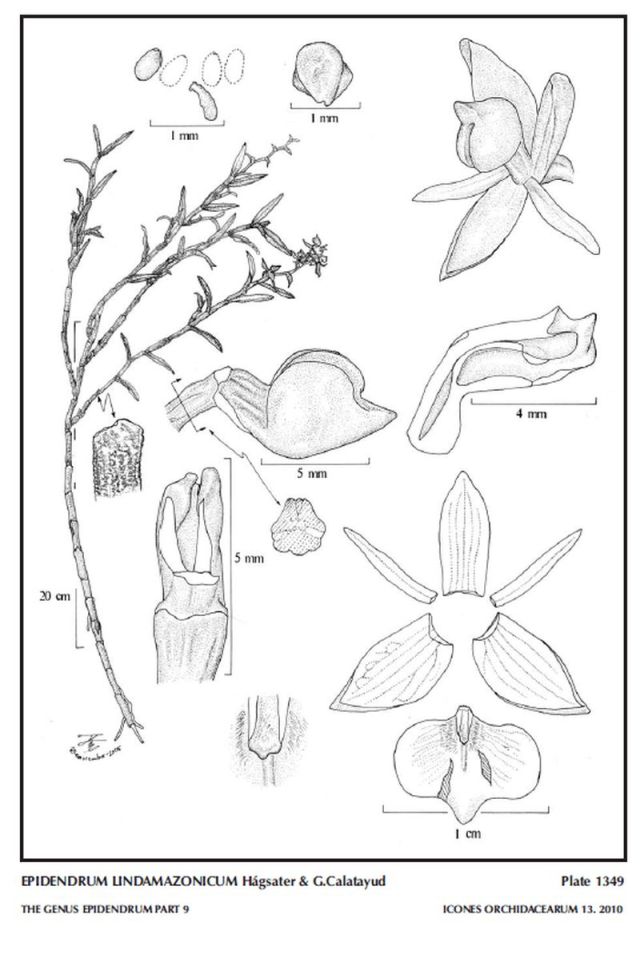 " Epidendrum lindamazonicum belongs to the GROUP Aquaticum characterized by the branching habit, distichous inflorescence, fleshy flowers and pubescent nectaries. The new species is recognized by the short plants, small, narrow, lanceolate-elliptic leaves, the erect, few-flowered, racemose inflorescence, sinuose, rachis, and the 3-lobed lip, large subquadrate, lateral lobes, the corners rounded, and the mid-lobe small and triangular, the column bent down at the base at about 45°; the callus and surrounding area is prominently pillose. It is very similar to E. lindae Hágsater & Dodson which has larger, wider leaves, a branching inflorescence, linear petals and a triquetrous ovary, the lip is only slightly cuneate but 3-lobed, with the lateral lobes subquadrate. Epidendrum stenocalymmum Hágsater & G.Calatayud is recognized by the small, ovate leaves, simple, erect raceme, entire, oblanceolate, unguiculate petals and the cuneate lip forming a deep sac in front of the column, so that the column is not visible. Epidendrum campylorhachis Hágsater has a 3-lobed lip with the base cuneate, narrowly oblanceolate petals and an oblique, deeply triquetrous ovary, in addition, the rachis segments are prominently incurved below each bract. The new species has been confused with Epidendrum alsum Ridley ex Thurn, a Venezuelan species with larger habit and leaves, a paniculate inflorescence and somewhat 3-lobed lip, the basal lobes broadly rounded, the petals elliptic. Epidendrum bractiacuminatum Hágsater & Dodson also has a distichous inflorescence, but is much larger overall, leaves 5.2 to 7.2" [13 to 18 cm] long, floral bracts .6 to .18" [15 to 45 mm] long, sepals .48 to .68" [12 to 17 mm] long, and the lip is cordiform." Hagsater etal 2010