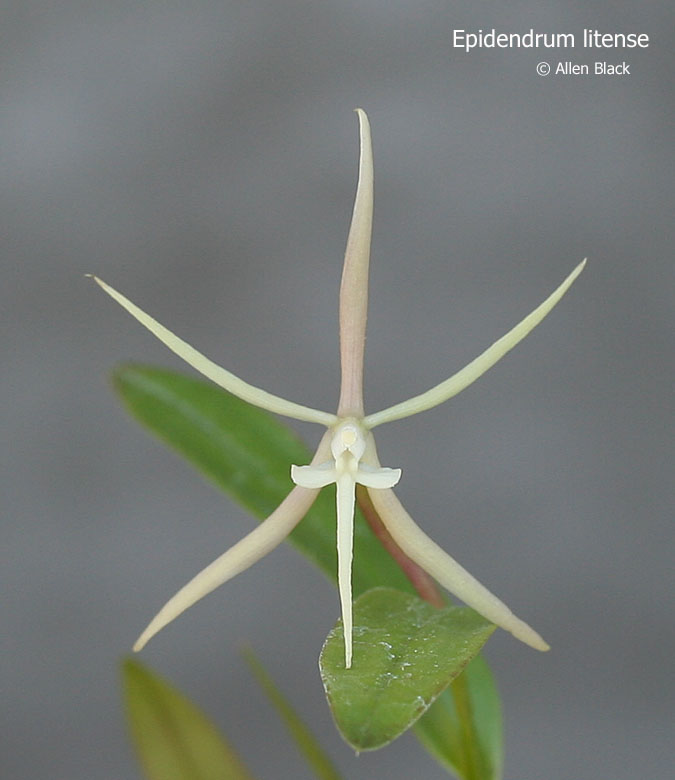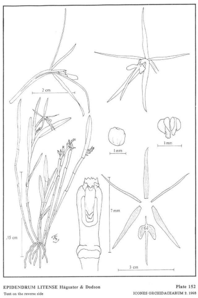 "Epidendrum litense is part of the GROUP Nocturnum characterized by the simple stems carrying large star-shaped flowers usually with a 3-lobed lip The species can be easily recognized by the small plants and flowers reminiscent of Epidendrum nocturnum Jacq., and especially similar to those of E. minus, found in the Amazon basin (i.e., on the other side of the Andes), which has wider floral segments, the petals being some .12" [3 mm] wide, and the stems and leaves are also wider. The same holds true for E.longicolle Lindl. and Epidendrum buenaventurae F. Lehm. & Kraenzl., both of which are found further up the coast, in Colombia, can be easily distinguished by the larger habit and flowers, the leaves being: 1.2 to 3.6" x .38" [3 to 9 x 0.82] cm and the petals 1.4 to 1.6" x .12" [35 to 40 x 3 mm] long" Hagsater etal 1993