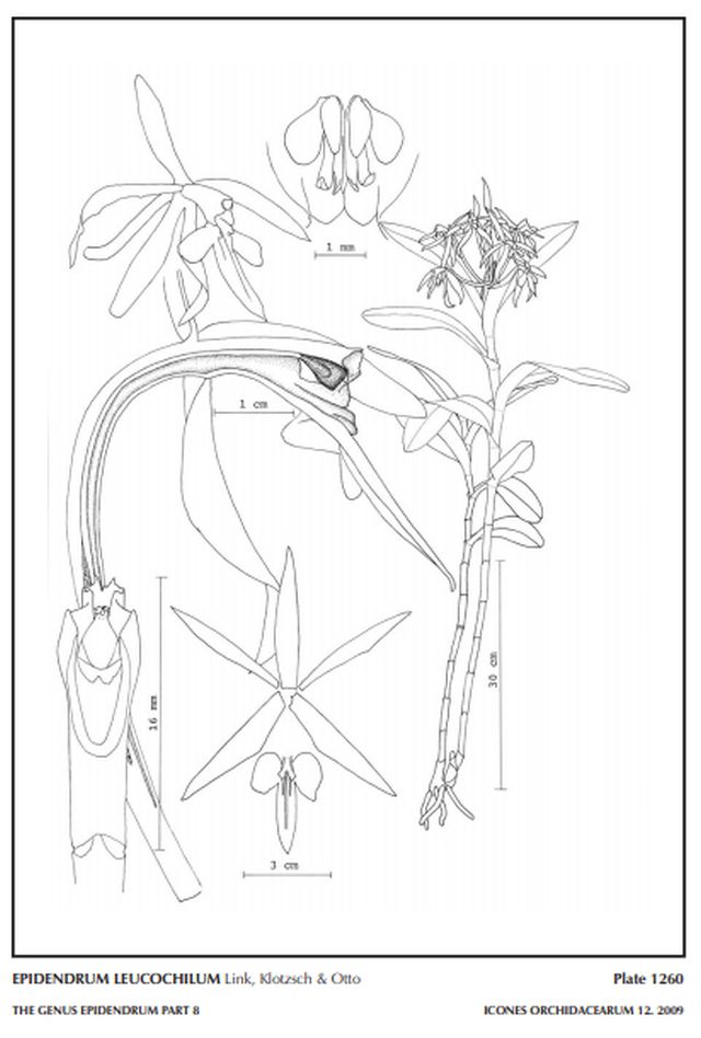 References W3 Tropicos, Kew Monocot list , IPNI ; Bonplandia Rchb.f 1854; Bonplandia Rchb.f 1855 as E spectatissimum; Repert. Spec. Nov. Regni Veg. Beih. 6: 70 Schlechter 1919; Repert. Spec. Nov. Regni Veg. Beih. 6: 72 Schlechter 1919 as E spectatissimum; Repert. Spec. Nov. Regni Veg. Beih. 7: 136 Schlechter 1920 as E leucarachne; Repert. Spec. Nov. Regni Veg. Beih. 7: 248 Schlechter 1920 as E leucarachne; Repert. Spec. Nov. Regni Veg. Beih. 7: 248 Schlechter 1920; Repert. Spec. Nov. Regni Veg. Beih. 7: 248 Schlechter 1920 as E longiflorum; Repert. Spec. Nov. Regni Veg. Beih. 7: 252 Schlechter 1920 as E spectatissimum; Atlas des Orchidees Cultivees Constantin 1920 drawing fide; Repert. Spec. Nov. Regni Veg. Beih. 8: 87 Ecuador Schlechter 1921 as E splendidum; Repert. Sp. Nov. Regni. Veg. Beih. 27: 68 Colombia Schlechter 1924; Repert. Spec. Nov. Regni Veg. Beih. Figuren-Atlas 57: 185 Schlechter 1929 as E leucarachne drawing hmm; Repert. Spec. Nov. Regni Veg. Beih. Figuren-Atlas 57: 365 Schlechter 1929 as E splendidium drawing fide; Venezuelan Orchids Illustrated Vol 1 Dunsterville & Garay 1959 as Epidendrum leucochilum drawing fide; AOS Bulletin Vol 39 No 7 1970 as E leucochilum photo fide; Flora de Venezuela Foldats Volumen XV Part 3 1970 as Epidendrum leucochilum drawing fide; Fieldiana Biology, Vol 33, 1st Supple. to the Orchids of Peru Schweinfurth 1970; Fieldiana Biology, Vol 33, 1st Supple. to the Orchids of Peru Schweinfurth 1970 as E spectatissimum; Die Orchideen 3 Auflage Bd 1 Sonderabdruck aus Schlechter Lieferung 9 513 - 576 Brieger, Maatsch and Senghas 1977 as E leucochilum; Die Orchideen 3 Auflage Bd 1 Sonderabdruck aus Schlechter Lieferung 9 513 - 576 Brieger, Maatsch and Senghas 1977; Orchids of Venezuela, An Illustrated Field Guide Vol 1 Dunsterville & Garay 1979 as E leucochilum drawing fide; AOS Bulletin Vol 49 No 10 1980 as Epidendrum leucochilum photo fide; Icones Planetarum Tropicarum plate 087 Dodson 1980 as E leuchochilum drawing fide; Native Colombian Orchids Vol 5 COS 1994 photo fide; Manual Of Orchids Stewart 1995; Icones Orchidacearum Peruviarum Plate 463 Bennett & Christenson 1998 drawing fide; Orchids of Venezuela [An illustrated field guide] Vol. 1 Ramiro and Carnevali 2000 as E leucochilum drawing fide; Orchids of Venezuela [An illustrated field guide] Vol. 1 Ramiro and Carnevali 2000 as E longiflorum drawing fide; Native Ecuadorian Orchids Vol 2 Dodson 2001 as E longiflorum drawing/photo fide; Orquideas Nativas del Tachira Cesar Fernandez 2003 photo fide; Flora of the Venezuelan Guayana Vol 7 Steyermark, Berry, Yatskievych and Holst 2003; AOS Bulletin Vol 74 No 10 2005 photo fide; Orquideologia Vol 26 No 1 2009 as E longiflorum photo fide; Orchid Species of Peru Zelenko Bermudez 2009 photo fide; Icones Orchidacearum Part 12 Plate 1260 Hagsater 2009 drawing fide; Orquideologia 27: #1 Ortiz & Hagsater 2010 photo fide; Las Orquideas del Peru Izerskyy & Bezverhov 2011 photo fide; Orchids of the Department of Valle De Cauca Colombia Vol 2 Kolanowska, Hagsater etal. 2014 drawing/photo fide; Orquideas, Tesoro de Colombia Vol 2 Ortiz & Uribe 2017 Photo fide; Orquideas de Farallones de Cali Galindo-Tarazona, Haelterman, Zuluaga Trochez and Sebastian Moreno 2020 photo fide