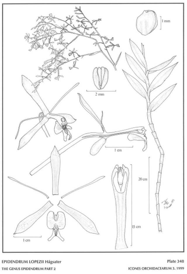 "E. lopezii belongs to the GROUP Pseudepidendrum SUBGROUP Paniculatum characterized by the caespitose habit with cane-like stems carrying acute to acuminate leaves usually booming on an apical inflorescence and carrying flowers with filiform petals, and a usually 3 lobed lip with 3 parallel fleshy keels, with the apical lobe often bifurcate and the "bird wing" type pollina. The species is recognized by its large, lax-flowered panicle, sepals .68 to .76" [17 to 19 mm] long, the flowers grayish inside, pinkish outside, the disk of the lip green with purple callus; the lateral lobes of the lip are oblong-rectangular and strongly retrorse, parallel to the column. It is similar to E. peraltum Schltr., a widespread species found from southern Colombia to Bolivia, which has smaller flowers with sepals .44 to .48" [11 to 13 mm] long and the lateral lobes with irregular margin and divergent, spreading, not parallel to the column." Hagsater etal 1999