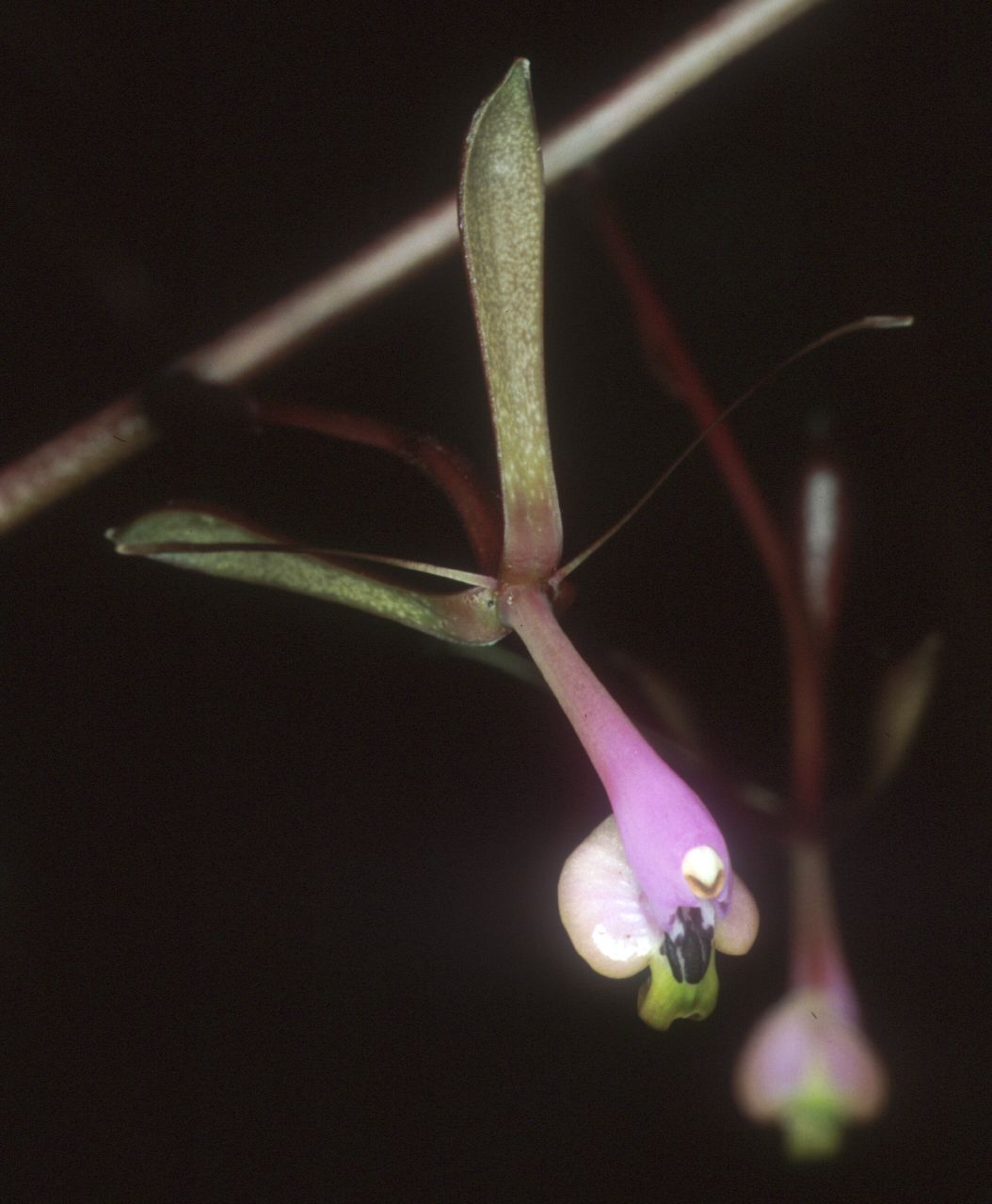 Found in upland Antioquia department of Colombia at elevations of 2200 to 2500 meters as a large sized, cold growing epiphyte or lithophyte with cane-like, terete stems carrying distichous, all along the stem, elliptic-lanceolate, acute, smooth, dark green, margin entire leaves that blooms in the winter on an apical, arising on a mature stem, paniculate, very large, laxly successively numerous flowered, several branched inflorescence with one third as long as the ovary, triangular, acuminate floral bracts carrying with resupinate flowers with greyish green on the inside sepals, dark rose lilac outside, greyish green petals, the column and the lateral lobes of the lip are rose lilac, the midlobe green, the callus pink with the apex purple, the basal half of the keels purple, the anther greenish and the ovary rose-lilac.